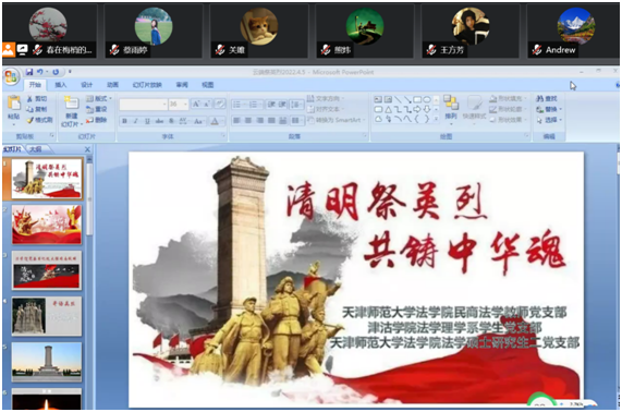 为追思英雄、缅怀先烈,教育引导党员发扬红色传统,推进党史学习教育常态化长效化,beat365亚洲版官网民商法学教师党支部、法学硕士研究生第二党支部联合津沽学院法学理学系学生党支部,于4月5日以线上形式举办“清明祭英烈 共筑中华魂”主题实践活动。院党委书记阮大强,院党委副书记、院长郝磊,院党委副书记、纪委书记鲁冰,副院长郭明龙出席活动,院党政办公室主任王欣和30余名师生党员参加活动,活动由民商法学教师党支部书记王春梅主持。