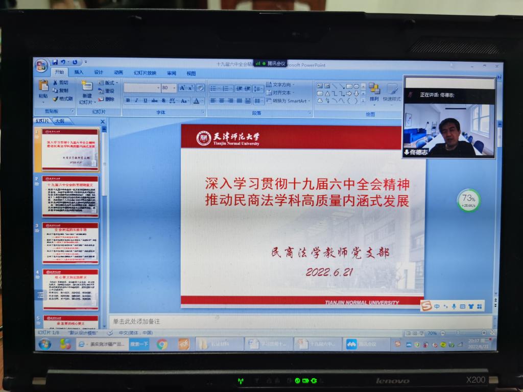 近日,为深入开展“迎盛会、铸忠诚、强担当、创业绩” 主题学习宣传教育实践活动,同时献礼“七一”党的生日,beat365亚洲版官网党委民商法学教师党支部组织支部党员开展“深入学习贯彻十九届六中全会精神 推动民商法学科高质量内涵式发展”集体学习交流会。佟德志副校长参加了学习交流会并进行指导,会议由民商法学教师党支部书记王春梅主持,支部全体党员参加,结合beat365亚洲版官网民商法学科发展,畅谈了自己对深入学习贯彻十九届六中全会精神的深刻领悟,坚定了初心使命与理想信念。