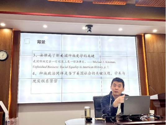 讲座第一部分,胡宇哲老师对此次讲座的主题进行了充分的阐释和说明,胡博士提出,种族史与政治史、女性史一道成为了当前美国史学的关键议题。其中,围绕种族政治学界发生了激烈的史学辩论,强调法律以及典型判例是了解美国种族史学的关键。种族政治也是当下美国社会的热门议题,史学考察与美国正在进行或者即将通过的法案之间具有紧密的联系。