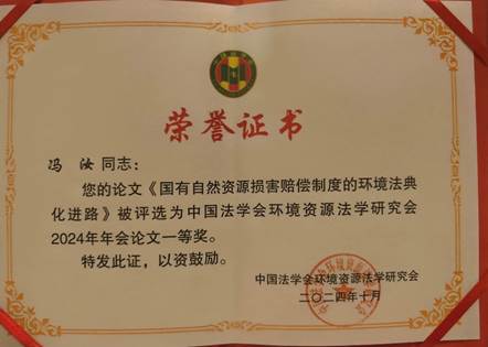 与会专家还向大会提交了近200篇高水平学术论文,从生态环境法典的基础理论、总则编、污染控制编、自然生态保护编、绿色低碳发展编、生态环境责任编等方面,对法典编纂的理论与实践问题,作了深入细致的阐释。beat365冯汝副教授所提交的论文《国有自然资源损害赔偿制度的环境法典化进路》被评选为年会论文一等奖,并在第六分会场“生态环境法典生态环境责任编的理论与实践问题”专题进行汇报发言。