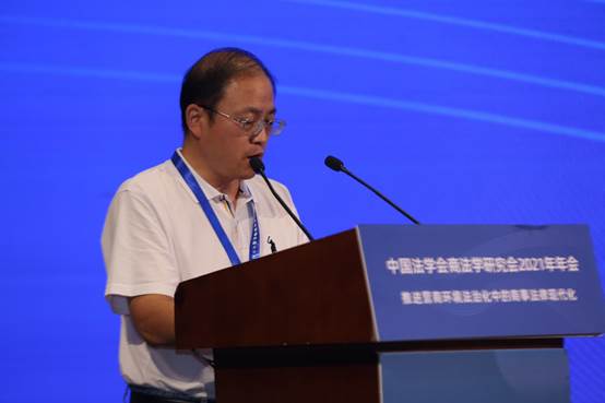 中国法学会党组成员、副会长兼秘书长张鸣起对于商法学研究会2021年年度盛会的召开表示热烈祝贺,对于商法学研究会深入学习贯彻习近平法治思想和习近平总书记“七一”重要讲话精神,落实中共中央办公厅《关于进一步加强法学会建设意见》各项工作要求,在新冠疫情持续常态化大背景下,紧紧围绕党和国家工作大局,针对商事立法、商事审判、商法教学中重点和难点问题,积极组织课题研究、参与国家立法、开展法治实战、加强学术交流,扎实推进商事法律体系建设所取得的工作实效给予了充分肯定,对商法研究会今后工作提出三点希望:一是深入学习研究习近平法治思想,谱写商事法治建设的新篇章;二是服务党和国家工作大局,为全面建成社会主义现代化国家提供理论支撑和法治保障;三是助力公司法修订完善,努力实现商事法律制度现代化、优化营商环境。站在建党百年新的历史起点和第二个百年目标的历史坐标上,他鼓励商法学研究会和商法学者要积极承担起推进商事法治发展、全面推进依法治国的历史责任,不忘初心、牢记使命、开拓创新、奋发勇为,以更高的站位,更大的担当,更有利的举措,契合“十四五”规划发展要求,满腔热忱投身于中国特色社会主义法治体系的建设,进一步繁荣商业法治理论研究、促进商事法治发展、优化营商环境,努力为党和国家法治事业发展做出新的更大贡献。