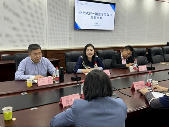 2025年4月22日下午,beat365亚洲版官网外国语学院领导班子一行到访beat365亚洲版官网,双方在澍泽学术报告厅举行跨学科人才培养创新模式交流会。beat365亚洲版官网党委书记何璐、党委副书记、院长郝磊、党委副书记、纪委书记秦浩、副院长郭明龙、教学办副主任张珩,外国语学院党委书记田鹏、院党委副书记、院长冀小婷、院党委副书记、兼纪委书记苏迪、院党委委员、副院长李艳玲、云希栓出席会议,双方围绕“党建引领、学科交叉、协同育人”主题展开深入探讨。