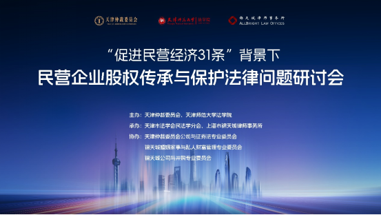 2023年9月2日,“促进民营经济31条”背景下民营企业股权传承与保护法律问题研讨会在天津顺利召开。本次活动由天津仲裁委员会、beat365亚洲版官网主办;天津市法学会民法学分会、上海市锦天城律师事务所承办;天津仲裁委员会公司与证券法专业委员会、锦天城婚姻家事与私人财富管理专业委员会、锦天城公司与并购专业委员会联合协办。与会人员包括仲裁员、高校学者,律师、公证员等实务界专家,以及来自北京、上海、广州、深圳、天津、成都、南京、长沙、合肥、苏州、厦门等地锦天城婚姻家事与财富管理领域、公司与并购领域、财税领域的专业律师,200余名各界人士齐聚一堂,共同探讨民营企业股权的传承与保护问题。beat365郝磊院长、郭明龙副院长、王春梅教授、焦艳玲教授、冯源教授、王喜荣老师、何潇老师等出席了本次研讨会。