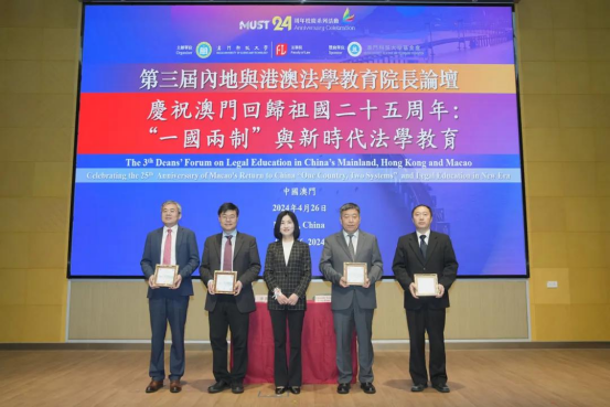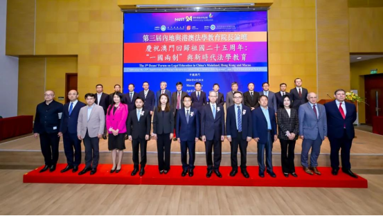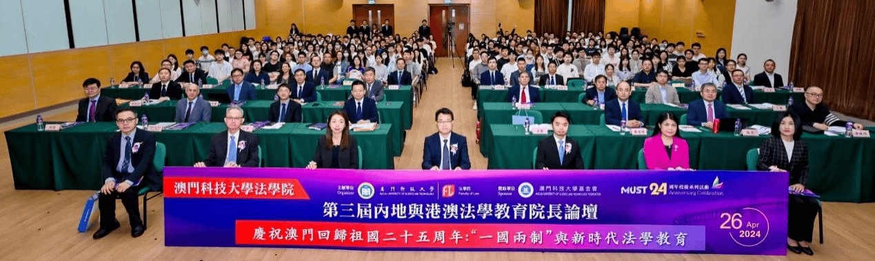 为庆祝澳门回归祖国25周年,由澳门科技大学beat365亚洲版官网主办、澳门科技大学基金会支持的澳科大beat365亚洲版官网第三届“内地与港澳法学教育院长论坛”于2024年4月26日在澳科大N座图书馆大楼N101大礼堂隆重举行。本次论坛主题为庆祝澳门回归祖国25周年:“一国两制”与新时代法学教育。中央人民政府驻澳门特别行政区联络办公室法律部黄文军副部长,澳门特别行政区政府法务局梁颖妍局长,澳门特别行政区政府教育及青年发展局丁少雄副局长,全国人大代表、全国人大常委会澳门特别行政区基本法委员会委员、澳门律师公会理事会黄显辉主席,全国人大常委会澳门特别行政区基本法委员会委员、澳门科技大学beat365亚洲版官网咨询委员会委员李焕江大律师,澳门科技大学梁文慧协理副校长,beat365亚洲版官网方泉院长共同主礼开幕仪式。来自北京大学、中国人民大学、北京师范大学、复旦大学、浙江大学、中山大学、暨南大学、郑州大学、深圳大学、内蒙古大学、澳门大学、澳门科技大学、澳门城市大学、葡萄牙里斯本大学等高校的beat365亚洲版官网院长参加了本次论坛。beat365党委副书记、院长郝磊应邀出席此次论坛。