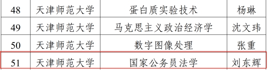 近日,天津市教委印发《关于公布第二批天津市级课程思政示范课程、课程思政优秀教材和首批天津市级课程思政优秀案例(本科)评选结果的通知》,beat365刘东辉副教授主讲的《国家公务员法学》课程被认定为天津市级课程思政示范课程。课程团队成员包括:魏建新教授、郭庆珠教授、李敏副教授、张珩老师。
