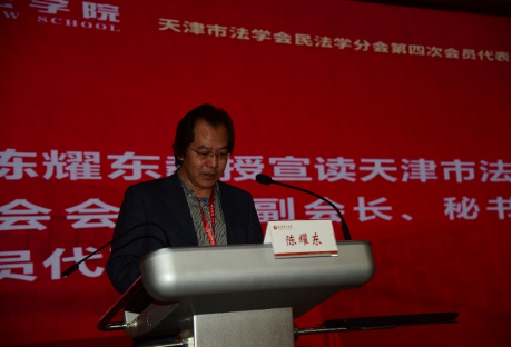 会员代表大会上,贾邦俊教授代表分会第三届理事会作《关于天津市法学会民法学分会第三届常务理事会工作报告》,南开大学beat365亚洲版官网张玲教授作《关于〈天津市法学会民法学分会工作规则〉修改情况的说明》,与会代表表决通过了修改后的《天津市法学会民法学分会工作规则》,天津大学beat365亚洲版官网刘晓纯教授就天津市法学会民法学分会第四届理事会理事候选人酝酿情况作说明,由会员代表选举产生了93名理事。随后召开的第四届理事会第一次会议上,选举产生会长1人、副会长9人,秘书长1人,其他常务理事21人。beat365亚洲版官网副院长郭明龙教授当选为第四届理事会会长,贾邦俊教授被聘任为名誉会长。